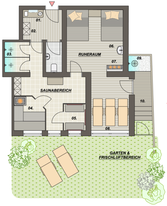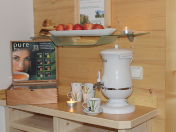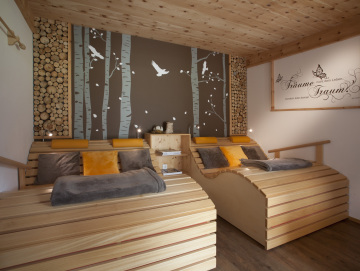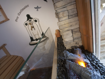 06. Ruheraum mit Liegen, Kaminfeuer, Trinkbrunnen und Zugang zur Frischluftterrasse